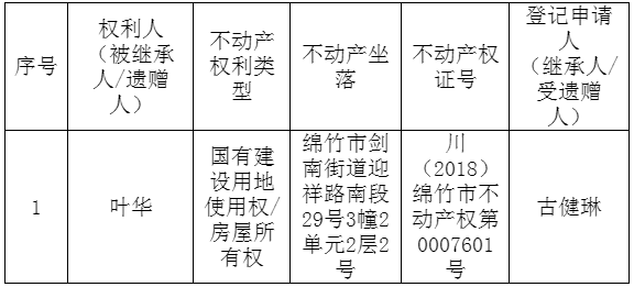 根据《不动产登记暂行条例实施细则》第十四条的规定,经初步查验,不动产登记机构拟对下列不动产权利办理不动产继承登记。根据《不动产登记暂行条例实施细则》第十七条的规定,现予公告。如有异议,请自本公告之日起十五个工作日内,将异议书面材料送达不动产登记机构。逾期无人提出异议或者异议不成立的,不动产登记机构将予以登记。