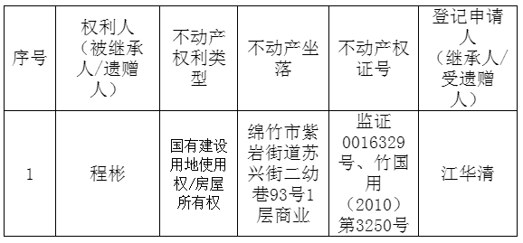根据《不动产登记暂行条例实施细则》第十四条的规定,经初步查验,不动产登记机构拟对下列不动产权利办理不动产继承登记。根据《不动产登记暂行条例实施细则》第十七条的规定,现予公告。如有异议,请自本公告之日起十五个工作日内,将异议书面材料送达不动产登记机构。逾期无人提出异议或者异议不成立的,不动产登记机构将予以登记。