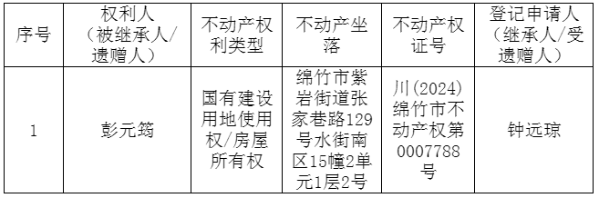 根据《不动产登记暂行条例实施细则》第十四条的规定,经初步查验,不动产登记机构拟对下列不动产权利办理不动产继承登记。根据《不动产登记暂行条例实施细则》第十七条的规定,现予公告。如有异议,请自本公告之日起十五个工作日内,将异议书面材料送达不动产登记机构。逾期无人提出异议或者异议不成立的,不动产登记机构将予以登记。