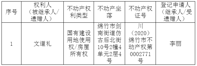 根据《不动产登记暂行条例实施细则》第十四条的规定,经初步查验,不动产登记机构拟对下列不动产权利办理不动产继承登记。根据《不动产登记暂行条例实施细则》第十七条的规定,现予公告。如有异议,请自本公告之日起十五个工作日内,将异议书面材料送达不动产登记机构。逾期无人提出异议或者异议不成立的,不动产登记机构将予以登记。